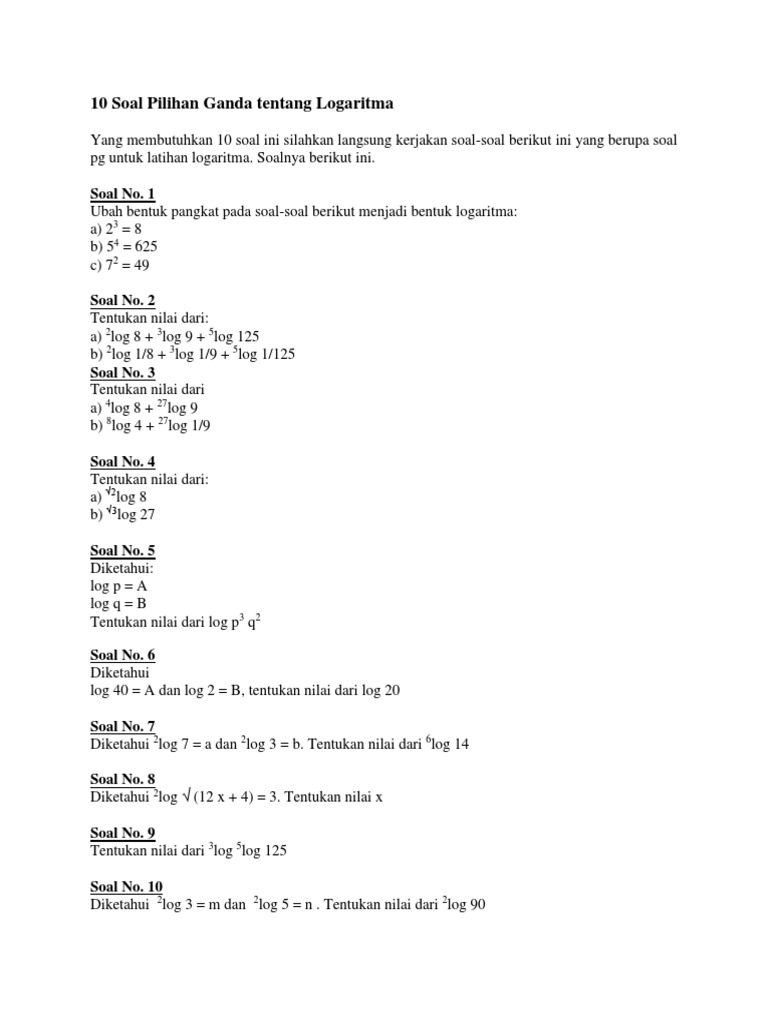Contoh soal logaritma kelas 10 pilihan ganda. Contoh file download contoh soal uts semester 1 tahun 2015 untuk sd semua kelas berikut ini adalah kumpulan dari berbagi sumber tentang contoh soal pilihan ganda matematika kelas 10 semester 1 yang bisa gunakan untuk administrasicontoh soal dan diunduh secara gratis dengan menekan tombol download biru dibawah ini. Salah satu soal matematika yang banyak dibutuhkan sebagai bahan latihan adalah soal latihan logaritma dan pembahasan. Pengertian logaritma bentuk logaritma dari a x b adalah.