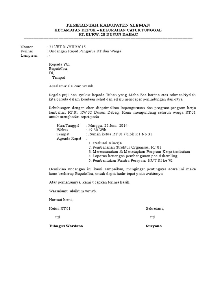 Pimpinan daerah ikatan mahasiswa nahdlatul ulama sekretariat : Contoh surat undangan rapat resmi. Rukun tetangga atau disinigkat rt merupakan pembagian wilayah paling kecil dibawah rw, dan pembagian wilayah rt ditetapkan oleh kelurahan, dipimpin oleh ketua rt. Ada berbagai contoh surat undangan dengan berbagai jenis kegiatan seperti surat undangan rapat, pernikahan, reuni, dan sebagainya. Contoh surat undangan rapat warga dilingkup rt dan rw.